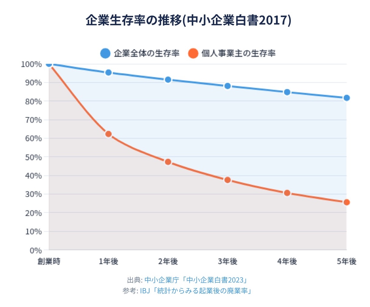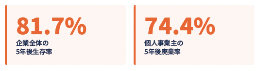 - 個人事業主は3年で62.4%、5年で74.4%が廃業