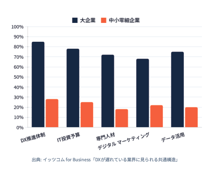 大企業は潤沢な資金でDXを推進する一方、中小零細企業は深刻なリソース不足に直面しています。