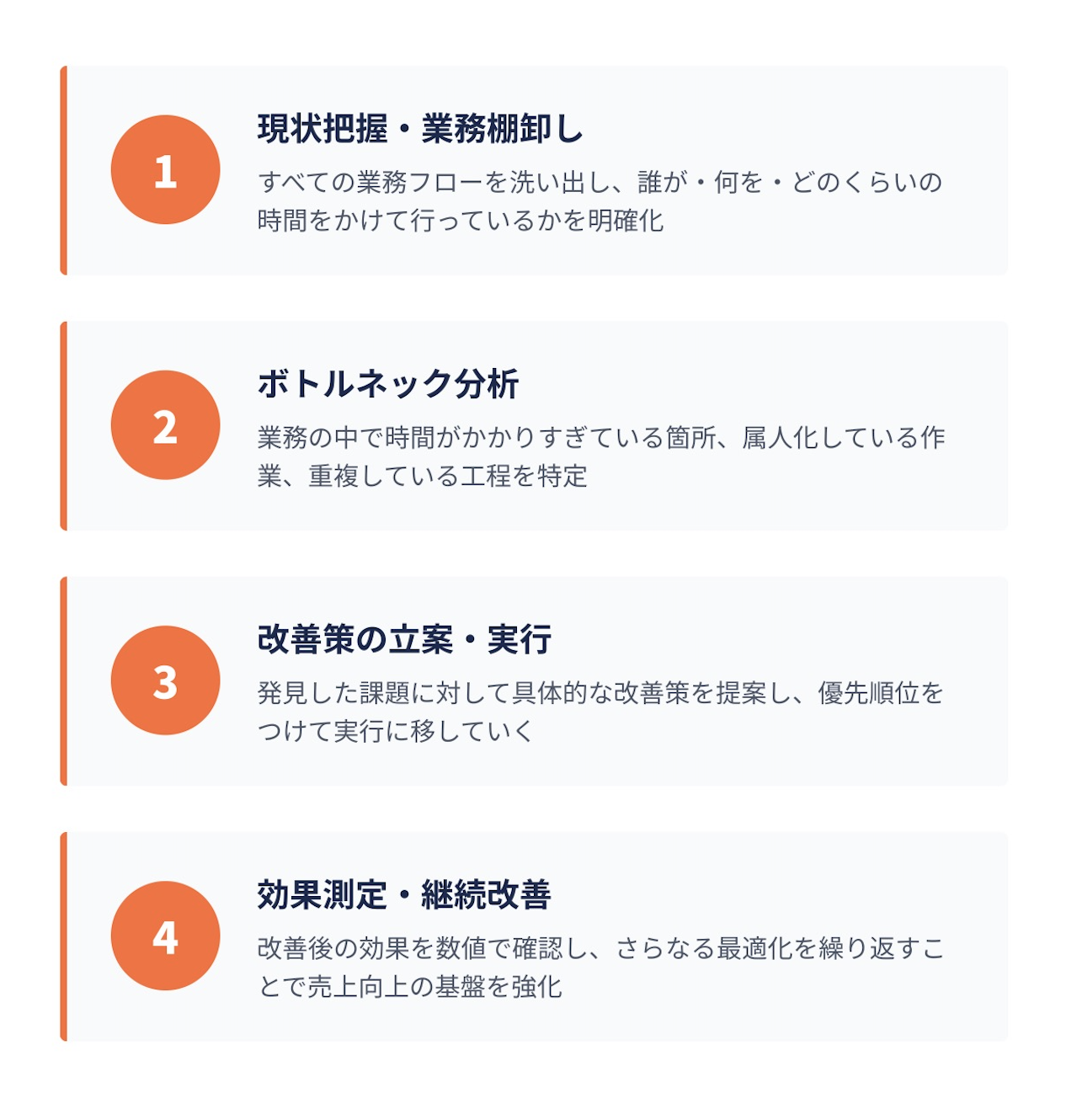業務の全体フローを見える化し、隠れた無駄や属人化、ボトルネックを徹底的に棚卸し。売上アップの確かな土台を構築します。