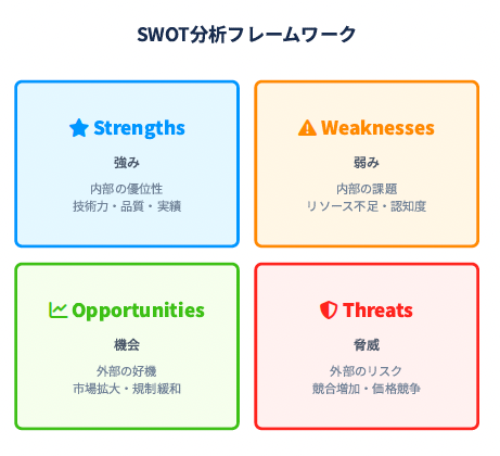 - Strengths(強み):高い技術力や独自のノウハウを活かす