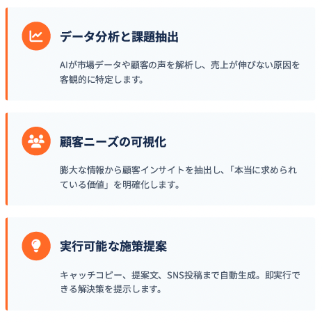 『ビジネスの地図』で明らかになった貴社の強みを基に、AIが膨大な市場データを分析し、競合のいない、あなただけの「戦うべき場所」を特定します。